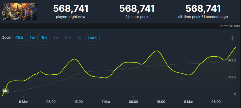 Slay the Spire 2 launched in early access this week and ABSOLUTELY CRUSHED it, crossing over 500,000 concurrent players (near Silksong levels), and it's good to see another big win for indie games.